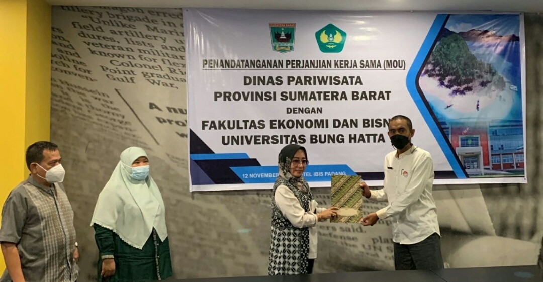 FGD digelar secara daring dan luring di Hotel IBIS Padang, sekaligus penanda tanganan kerjasama antara Dekan Fakultas Ekonomi dan Bisnis UBH, Dr. Erni Febrina Harahap, S.E., M. Si. dengan Dinas Pariwisata Sumatera Barat.