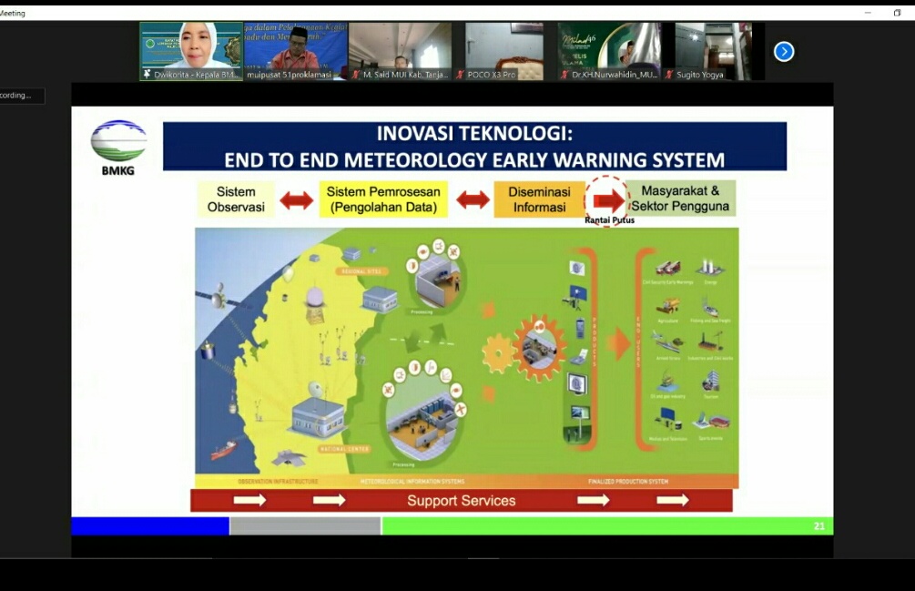 “Hal ini karena pengaruh ulama yang mampu mensyiar dan berdakwah, sehingga dapat memberikan pemahaman pada umat mengenai mitigasi bencana. Mengingat hampir seluruh wilayah Indonesia adalah daerah rawan bencana,” ungkap Dwikorita saat Rapat Koordinasi dengan Majelis Ulama Indonesia secara virtual di Jakarta, Senin (27/12).