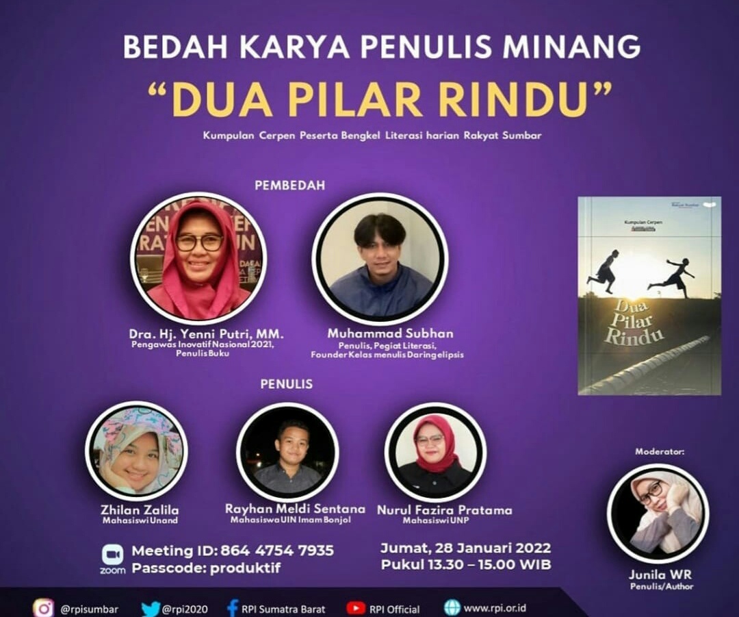 IWOSUMBAR.COM PADANG -BUKu KUMPULAN cerpen “Dua Pilar Rindu” hasil karya sebanyak 20 siswa dari binaan Bengkel Literasi Rakyat Sumbar akan dikupas habis oleh Rumah Produktif Indonesia (RPI)