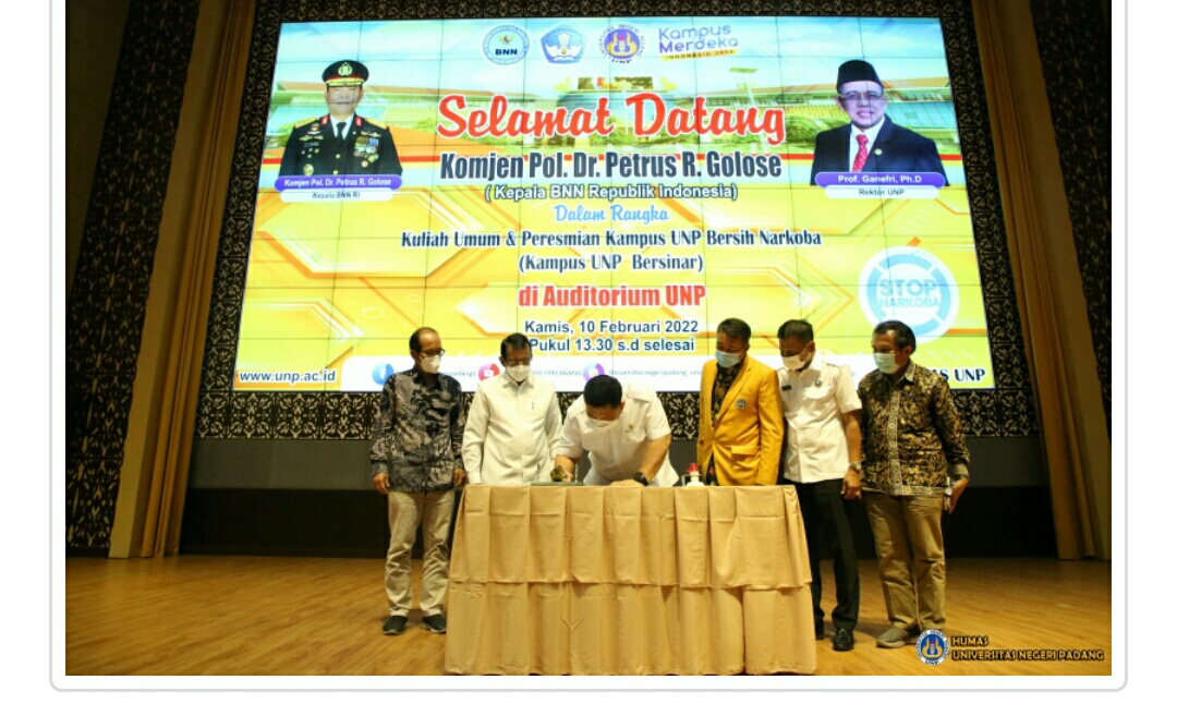 Iwosumbar.com, Padang -Kepala Badan Nasional Narkotika (BNN) Republik Indonesia Komjen Pol. Dr. Drs. Reihard Petrus Golose, M.M, memberikan kuliah umum sekaligus Meresmikan Kampus Bersih Narkoba di Universitas Negeri Padang Kamis (10/2).