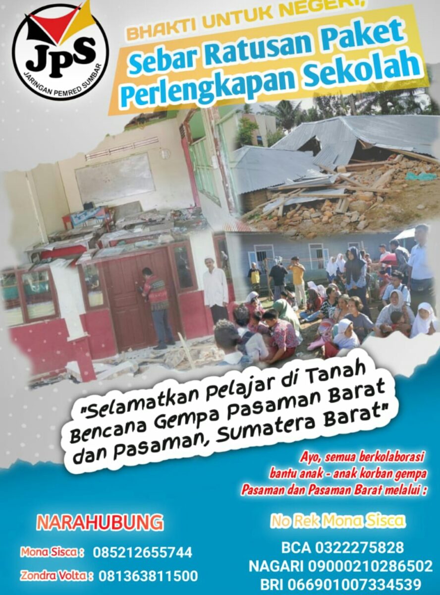“Kami tak akan biarkan semangat pelajar di tanah bencana itu sirna, JPS bersama mitra harmonisnya teridiri dari banyak tokoh Sumbar menggerakan donasi Peduli Pelajar Tanah Bencana,” ujar pentolan JPS Sumbar Adrian Toiak.
