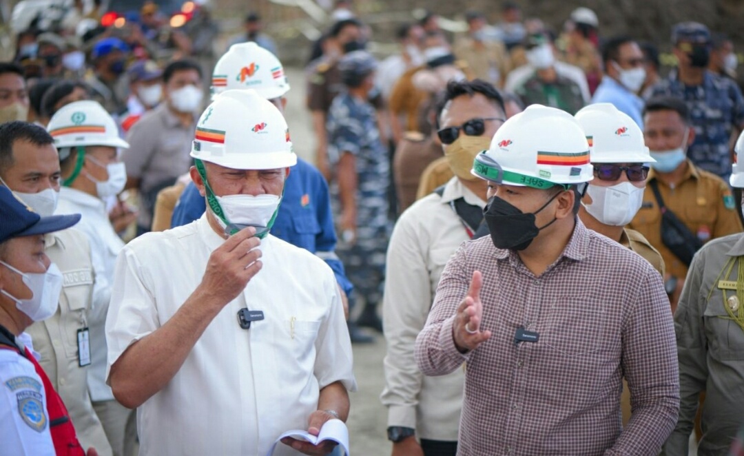 Didampingi Kepala Bandara, Rudi Pitoyo, gubernur beserta rombongan melihat langsung proses pekerjaan landasan maupun gedung terminal yang sedang berlangsung.