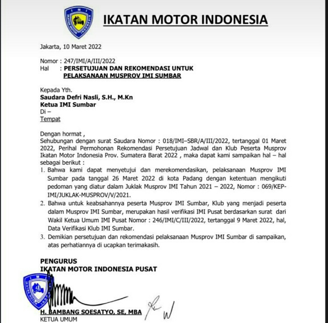 Menurut Desyontori, IMI Sumatra Barat sendiri sebelumnya sudah melayangkan surat permohonan rekomendasi persetujuan jadwal dan klub peserta Musprov IMI Sumbar 2022 dengan nomor surat: 018/IMI-SBR/A/III/2022 tertanggal 1 maret 2022.