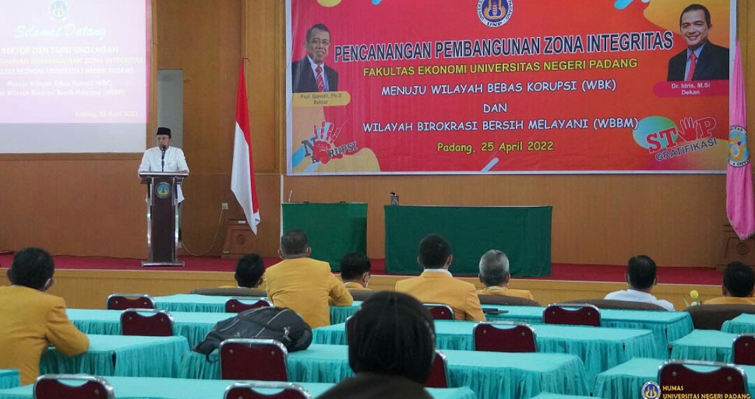 Iwosumbar.com, Padang- Rektor Universitas Negeri Padang (UNP) Prof. Ganefri, Ph.D, Senin/25 April 2022 di Aula Prof. Kamaluddin mencanangkan Fakultas Ekonomi (FE) sebagai unit kerja yang menyelenggarakan pembangunan Zona Integritas (ZI) menuju Wilayah Bebas Korupsi (WBK) dan Wilayah Birokrasi Bersih Melayani (WBBM).