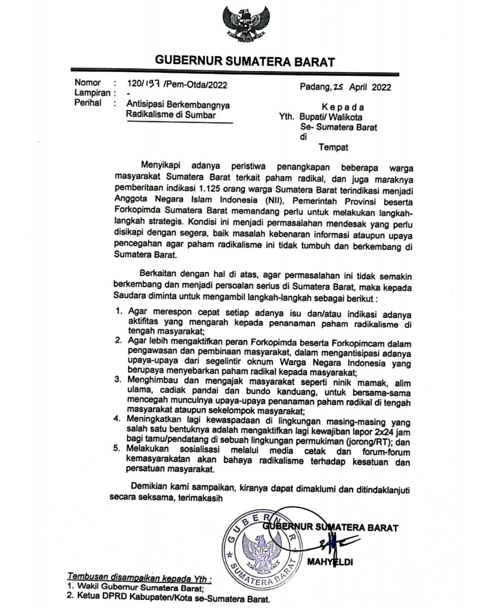 Dalam surat bernomor 120/197/Pem-Otda/2022, perihal antisipasi berkembangnya radikalisme di Sumbar, tanggal 25 April 2022, disebutkan bahwa Pemerintah Provinsi beserta Forkopimda Sumatera Barat memandang perlu untuk melakukan langkah langkah strategis.