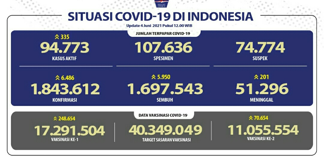IWOSUMBAR.COM, JAKARTA – Perkembangan penanganan pandemi Covid-19 per 4 Mei 2021 tercatat pertambahan pasien sembuh hari ini sebanyak 5.950 kasus