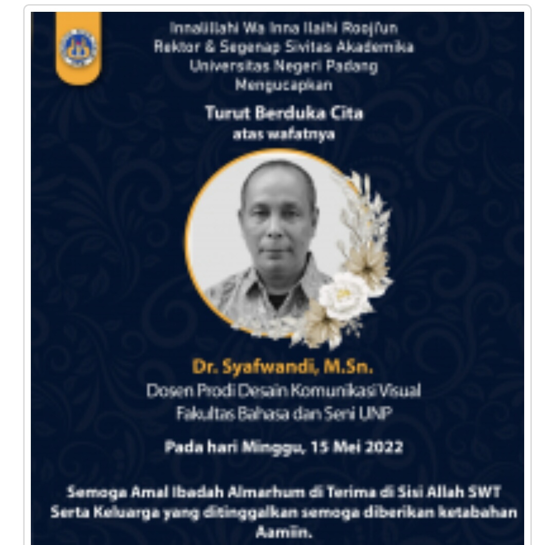 IWOSUMBAR.COM, PADANG – Innalilahi wa innalilahi Rojiun,. Berita duka Dr. Syafwandi M.Sn tenaga pendidik dan Dosen senior dari Universitas Negeri Padang (UNP) berpulang ke Rahmattullah menghadap sang khalik.