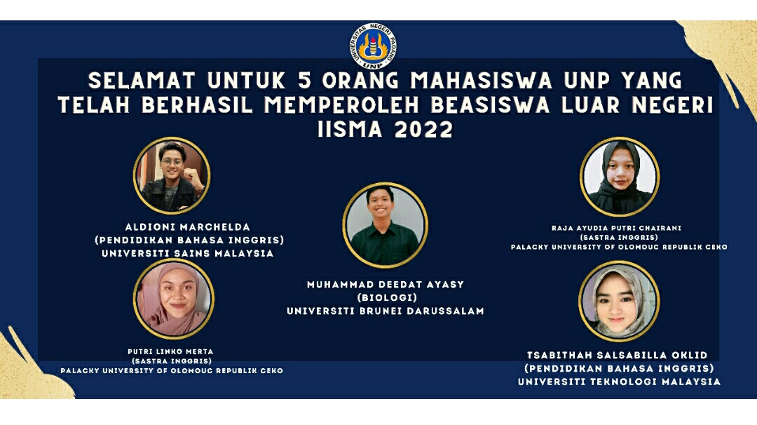 Berikut nama-nama mahasiswa UNP yang telah dinyatakan LULUS oleh Pokja IISMA yakni ; 1. Aldioni Marchelda dari Pendidikan Bahasa Inggris (Universiti Sains Malaysia, Malaysia), 2. Raja Ayudia Putri Chairani dari Prodi Sastra Inggris (Palacky Universityof Olomouc, Republik Ceko), 3. Tsabithah Salsabilla Oklid dari prodi Pendidikan Bahasa Inggris (Universiti Teknologi Malaysia, Malaysia), 4. Muhammad Deedat Ayasy dari prodi Biologi (Universiti Brunei Darussalam, Brunei), dan 5. Putri Linko Merta dari prodi Sastra Inggris (Palacky Universityof Olomouc, Republik Ceko).