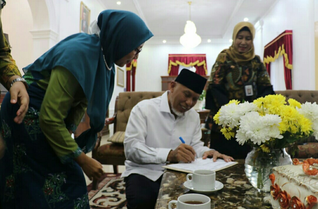Didampingi Kepala BPS Sumbar Herum Fajarwati, Kadis Kominfotik Jasman, Kadinsos Ary Yuswandi dan Kepala Bappeda Medi Iswandi, gubernur memberikan keterangan saat proses pendataan Regsosek yang diselenggarakan Tim BPS di rumah dinas (15/10).