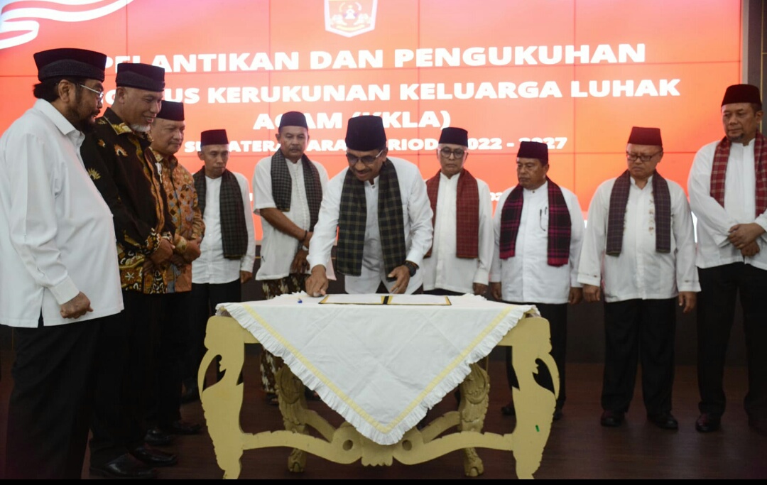 IWOSUMBAR.COM, PADANG — PENGURUS Kerukunan Keluarga Luhak Agam (KKLA) Provinsi Sumbar untuk periode 2022-2027, dilantik oleh Gubernur Mahyeldi di Auditorium Gubernuran, Minggu (26/2/2023).