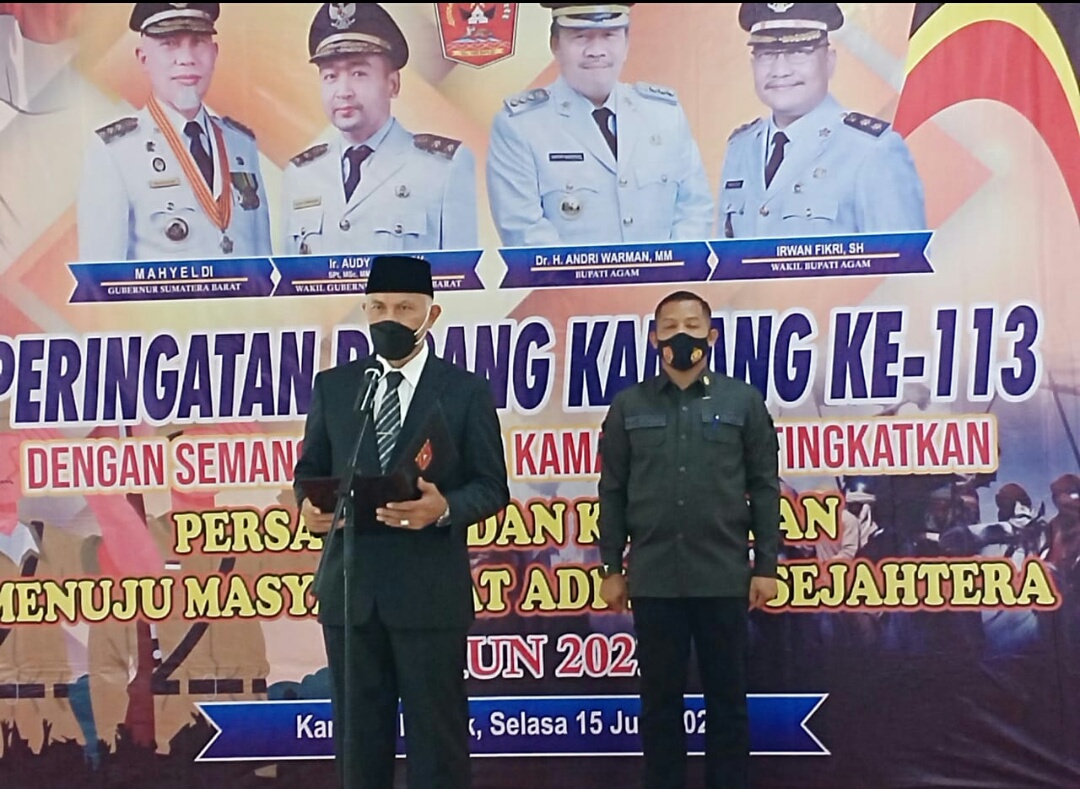IWOSUMBAR.COM, AGAM – Memperingati Perang Kamang ke-113 dilangsungkan di Aula Kantor Camat Kamang Magek, Selasa (15/6/2921). Gubernur Mahyeldi bertindak sebagai Inspektur Upacara.