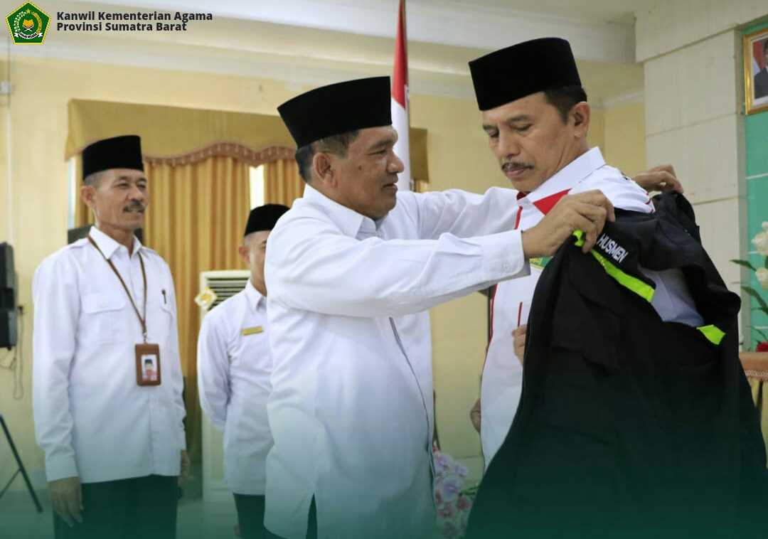 Acara pelepasan ditandai dengan pemasangan rompi secara simbolis oleh Kepala Kanwil Kemenag Sumbar kepada Kepala Bidang PHU, Ramza Husmen sebagai petugas Daker di Arab Saudi. (r)