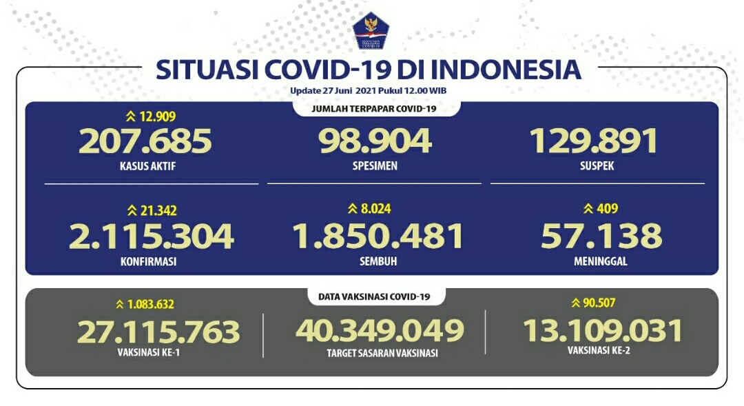 Adapun kasus penambahan positif juga bertambah berjumlah sebanyak 21.342 orang. Sehingga total kasus positif telah berjumlah sebanyak 2.115.304 kasus.