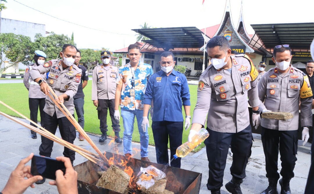 IWOSUMBAR.COM, PADANG – SATRESNARKOBA Polres 50 Kota berhasil mengungkap kasus narkotika dan langsung dengan pemusnahan barang bukti 10 Kg ganja kering.