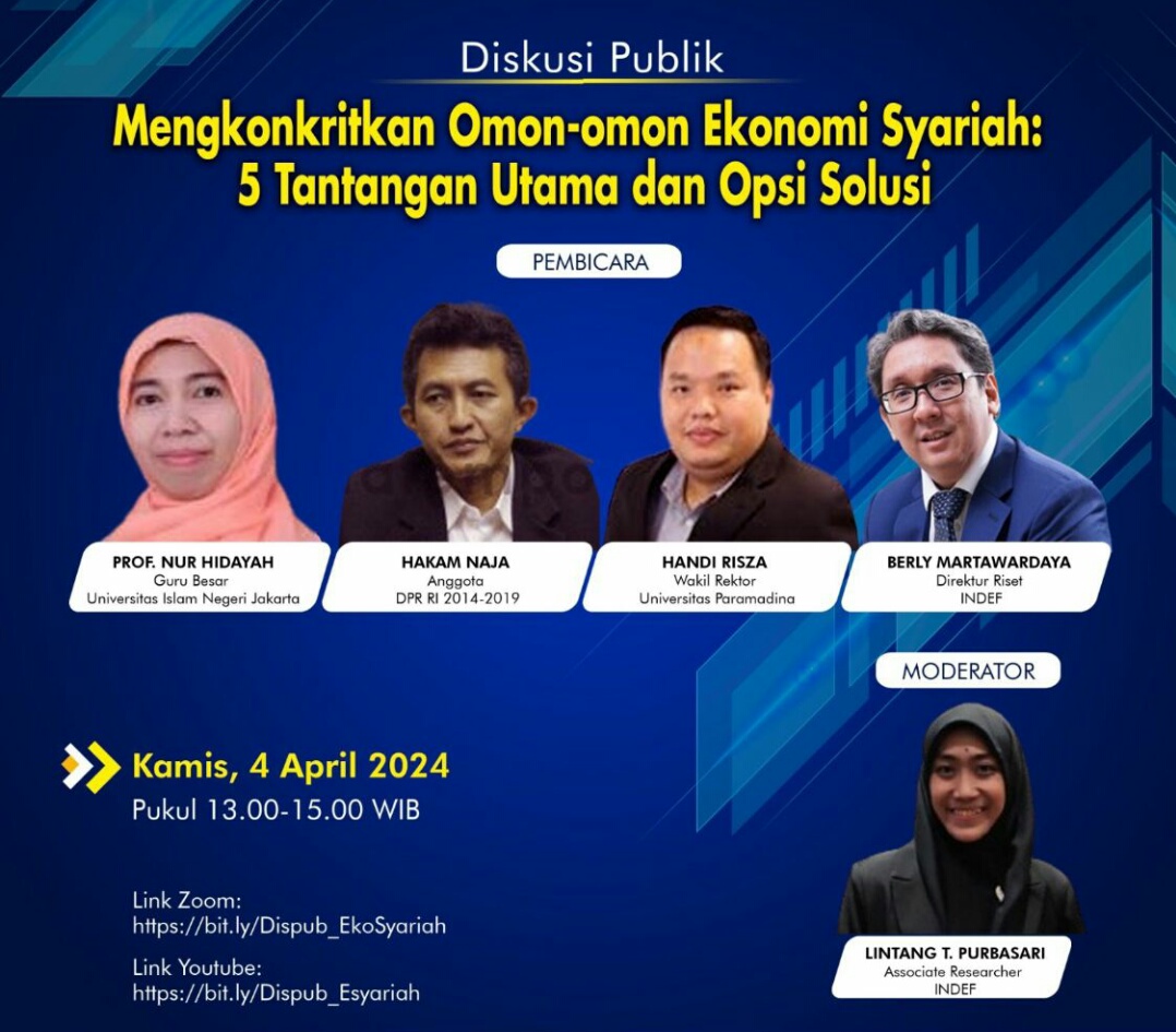 Disampaikan Prof. Nur Hidayah dalam diskusi public yang diadakan oleh Indef secara daring, dengan tema “Mengkonkretkan Omon-Omon Ekonomi Syariah: 5 Tantangan Utama dan Opsi Solusi”, yang di moderatori oleh Lintang Titian Purbasari, Kamis (4/4/2024)