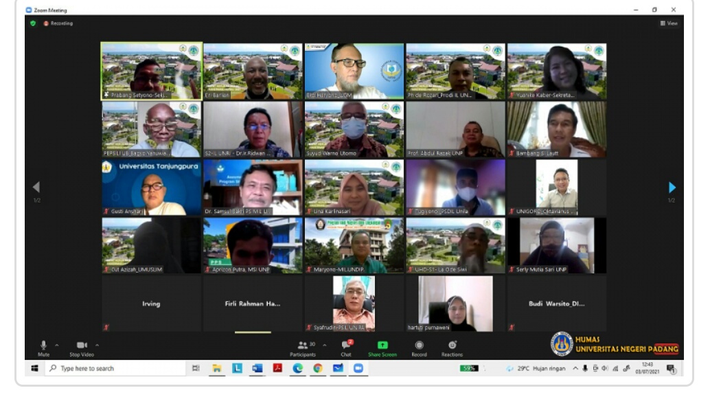 Rakernas digelar, Sabtu 3 Juli 2021 secara daring dengan aplikasi Zoom Meeting yang diikuti 50 peserta mewakili 40 Perguruan Tinggi di Indonesia, diantaranya dari UI, UGM, IPB, Unbraw, UNS, Unand, Unri, UNJ, UNP, Untan, Unhaleo, Uncen, Undana, Unkhair dan sebagainya.