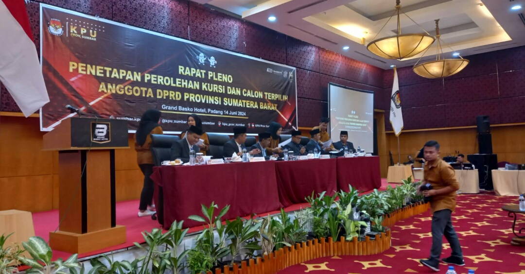 IWOSUMBAR.COM, PADANG- RAPAT Pleno Penetapan Perolehan Kursi dan Calon Terpilih Anggota DPRD Provinsi Sumatera Barat di Gelar Komisi Pemilihan Umum (KPU) di Grand Basko Hotel, Jumat 14 Juni 2024.