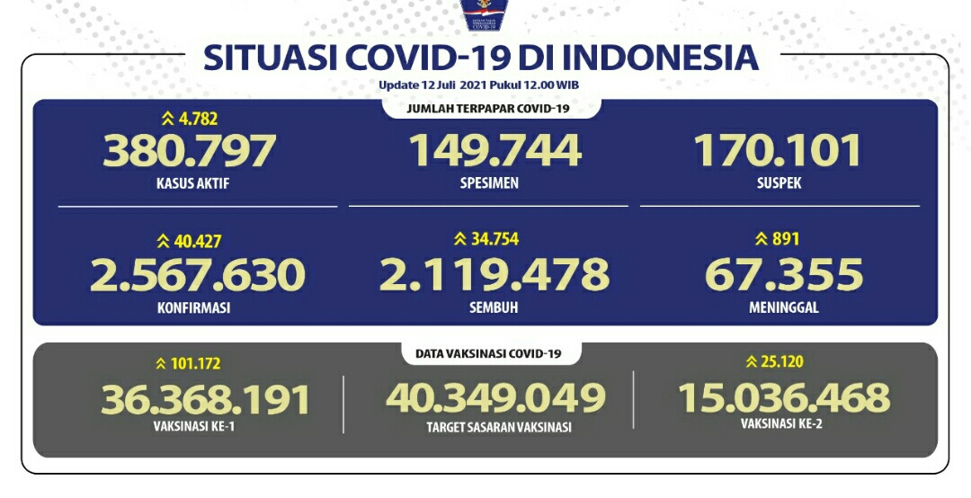 IWOSUMBAR.COM, JAKARTA – Perkembangan penanganan pandemi Covid-19 per 12 Juli 2021 tercatat pertambahan pasien sembuh hari ini sebanyak 34.754 kasus