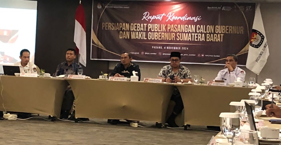 IWOSUMBAR.COM, PADANG – Menjelang pelaksanaan Pilkada Serentak 2024, Komisi Pemilihan Umum (KPU) Provinsi Sumatera Barat menggelar rapat terkait persiapan debat publik bagi pasangan calon Gubernur dan Wakil Gubernur Sumatera Barat. Senin, 4 November 2024.