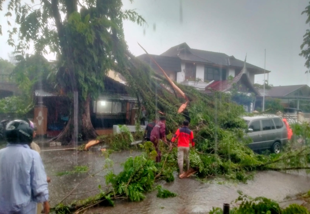 Insiden ini terjadi akibat hujan deras yang disertai angin kencang, yang mengakibatkan sebuah pohon jenis Lansano tumbang dan menimpa satu unit mobil minibus.