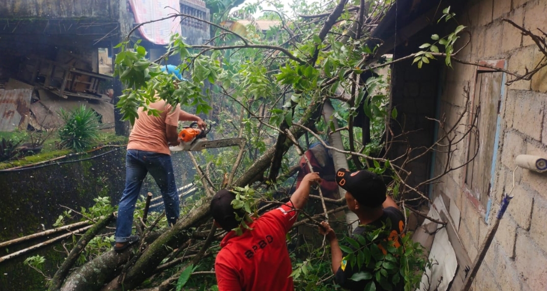 Pohon tumbang tersebut menimpa rumah warga akibat hujan lebat disertai angin kencang yang melanda wilayah sekitar.