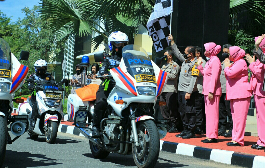 Puluhan para Polwan dengan menggunakan sepeda motor dan mobil dinas yang membawa paket sembako, langsung bergerak menyerahkan bantuan tersebut kepada masyarakat.