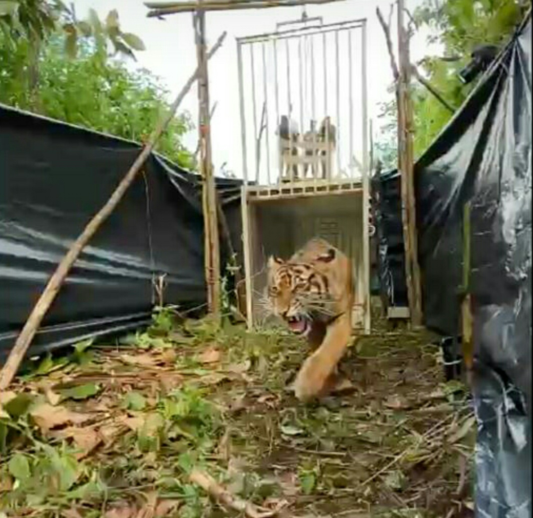 IWOSUMBAR.COM, JAKARTA – Kementerian Lingkungan Hidup dan Kehutanan (KLHK) melalui Balai Konservasi Sumber Daya Alam (BKSDA) Sumatera Barat melakukan pelepasliaran Harimau Sumatera (Panthera tigris sumatrae) berjenis kelamin betina bernama “Sipogu”, di lanskap Panti Batang Gadis Kawasan Hutan Lindung Pasaman Barat pada Jumat (30/7).