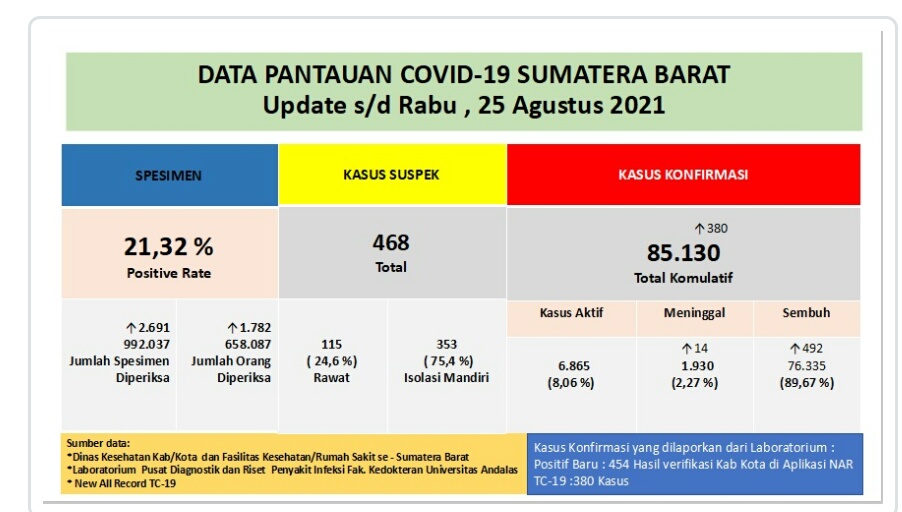 IWOSUMBAR.COM, PADANG – Satgas Covid Sumbar mencatat total kamulatif warga terpapar virus corona di Sumbar sampai hari ini Rabu (25/8/2021) telah 85.130 orang terkonfirmasi positif covid-19.