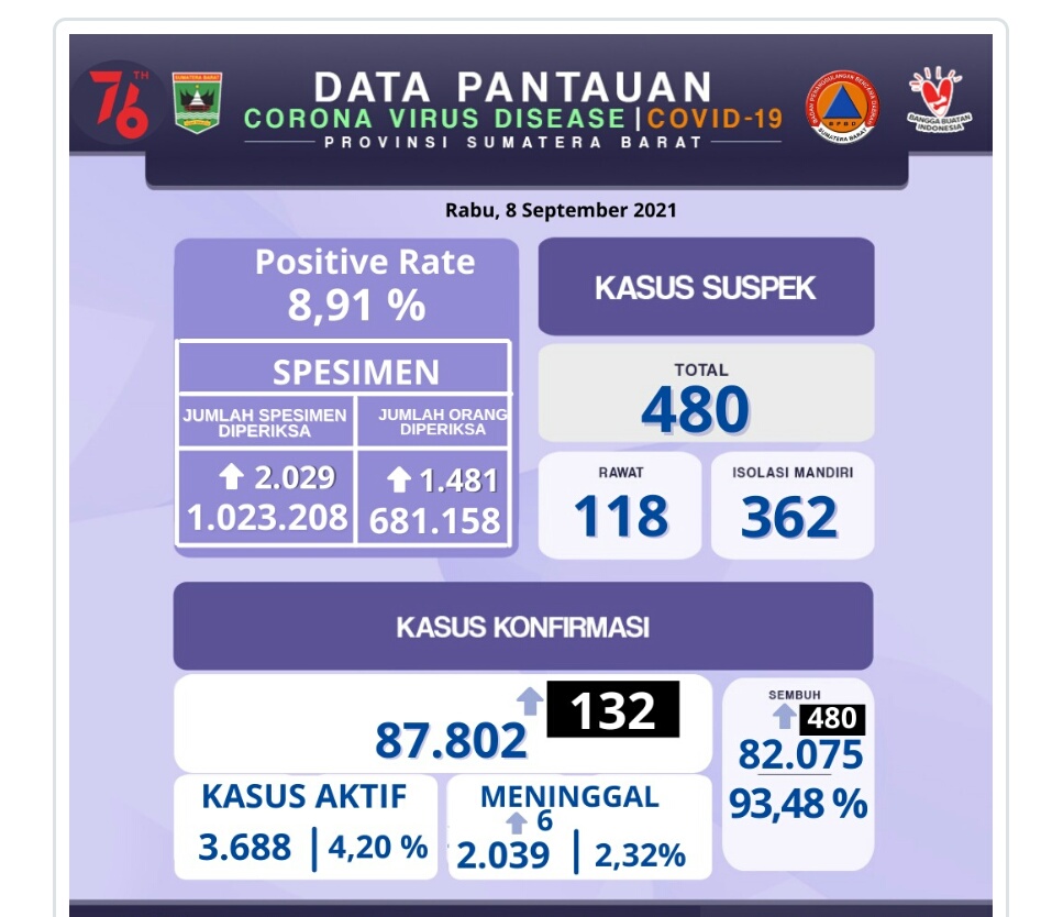 Hari ini dilaporkan terjadi penambahan 132 kasus warga sumbar positif terinfeksi covid-19.