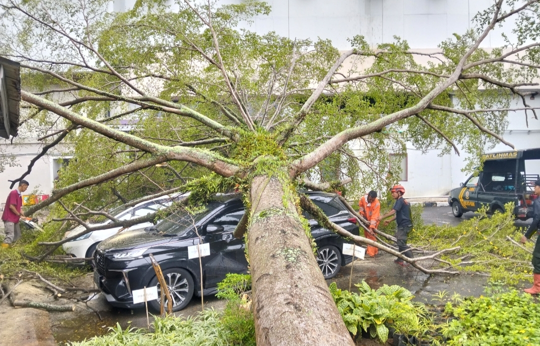 PADANG- Hujan deras disertai angin kencang menyebabkan satu pohon tumbang dan menimpa dua unit mobil yang sedang terparkir di area Hotel Mercure Padang, Jalan Purus IV No. 8, Kelurahan Purus, Kecamatan Padang Barat. Rabu (26/11).