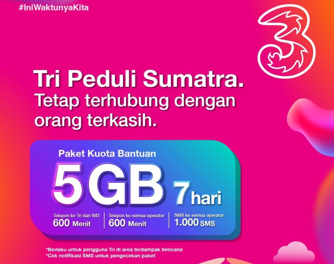 Paket ini mulai dapat dinikmati pelanggan terdampak secara bertahap tepat tanggal 4 Desember 2025, pukul 00.00. Paket khusus bencana ini mencakup 5GB kuota data, 600 menit panggilan ke semua operator, 600 menit panggilan ke sesama IM3 dan Tri, serta 1.000 SMS ke seluruh operator, yang seluruhnya dapat digunakan selama 7 hari masa aktif, demikian juga masa berlaku kartu IM3 dan Tri telah diberikan keistimewaan