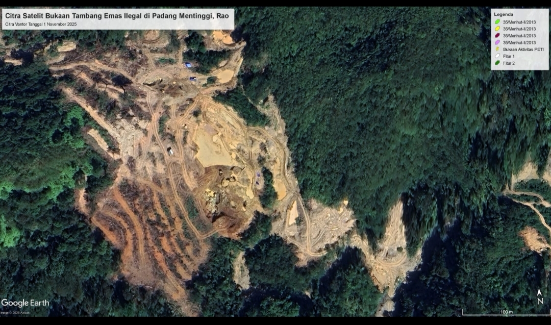 Temuan WALHI Sumatera Barat melalui survei lapangan dan citra satelit resolusi tinggi menunjukkan puluhan titik PETI beroperasi terang-terangan: lubang galian, kolam racun, sungai yang berubah warna, dan jalan tambang yang saling terhubung. Ini bukan aktivitas sembunyi-sembunyi. Jarak lokasi tambang yang hanya sekitar dua kilometer dari Mapolsek Rao membuktikan satu hal: aparat penegak hukum tahu dan memilih diam. Diamnya aparat adalah kejahatan ldengan cara tidak bertindak.