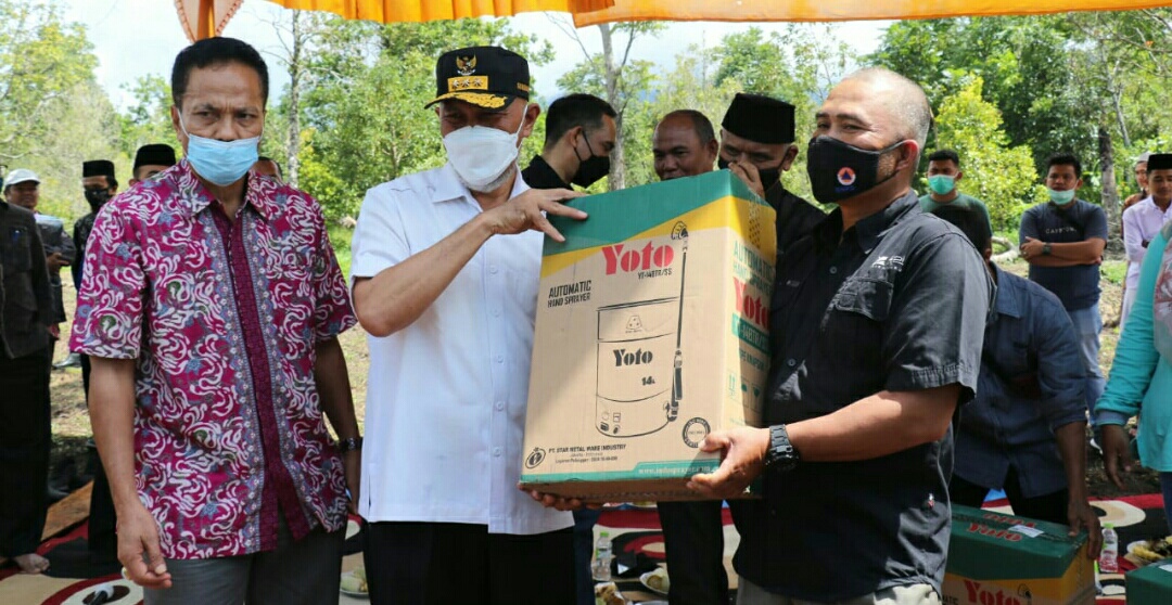 Selain bantuan paket hortikultura, gubernur juga menyerahkan bantuan electric handsprayer atau alat semprot untuk enam kelompok tani di magari di lereng Gunung Talang tersebut.