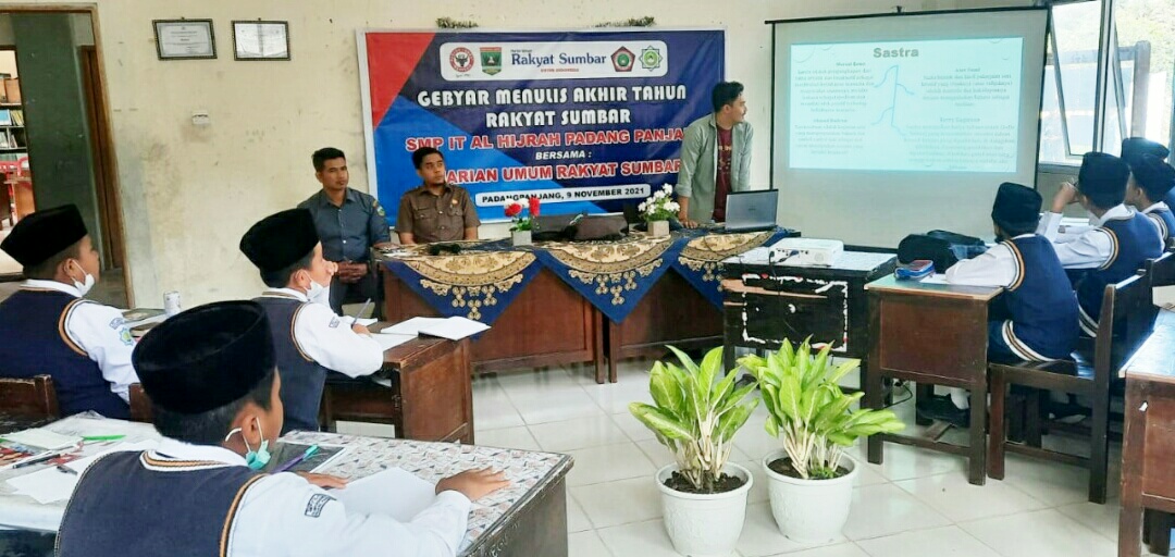 Iwosumbar.com, Sumbar -Gebyar Menulis Akhir Tahun Rakyat Sumbar, kerjasama Harian Umum Rakyat Sumbar, PT. Semen Padang dan Dinas Pendidikan Provinsi Sumbar yang dilaksanakan di SMP Islam Terpadu (IT) Al Hijrah Padangpanjang mengahdirkan dua narasumber, Redaktur Pelaksana Harian Umum Rakyat Sumbar Jon Kenedi dan Redaktur Sastra dan Budaya Ubai Dillah Al Anshori, Selasa (9/11).