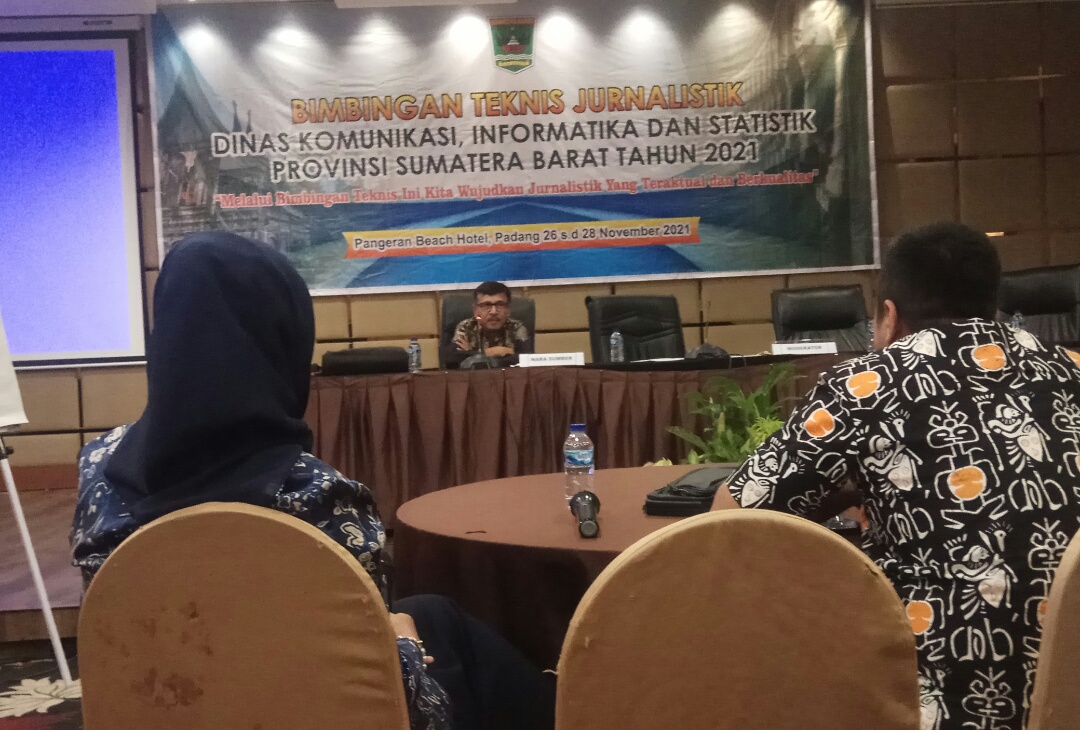 Iwosumbar.com Padang -Khairul Jasmi Hadir sebagai Narasumber pada sesi kedua gelaran Bimbingan Teknis (Bimtek) bertema “Melalui Bimbingan Teknis ini Kita Wujudkan Jurnalistik Yang Teraktual dan Berkualitas”.