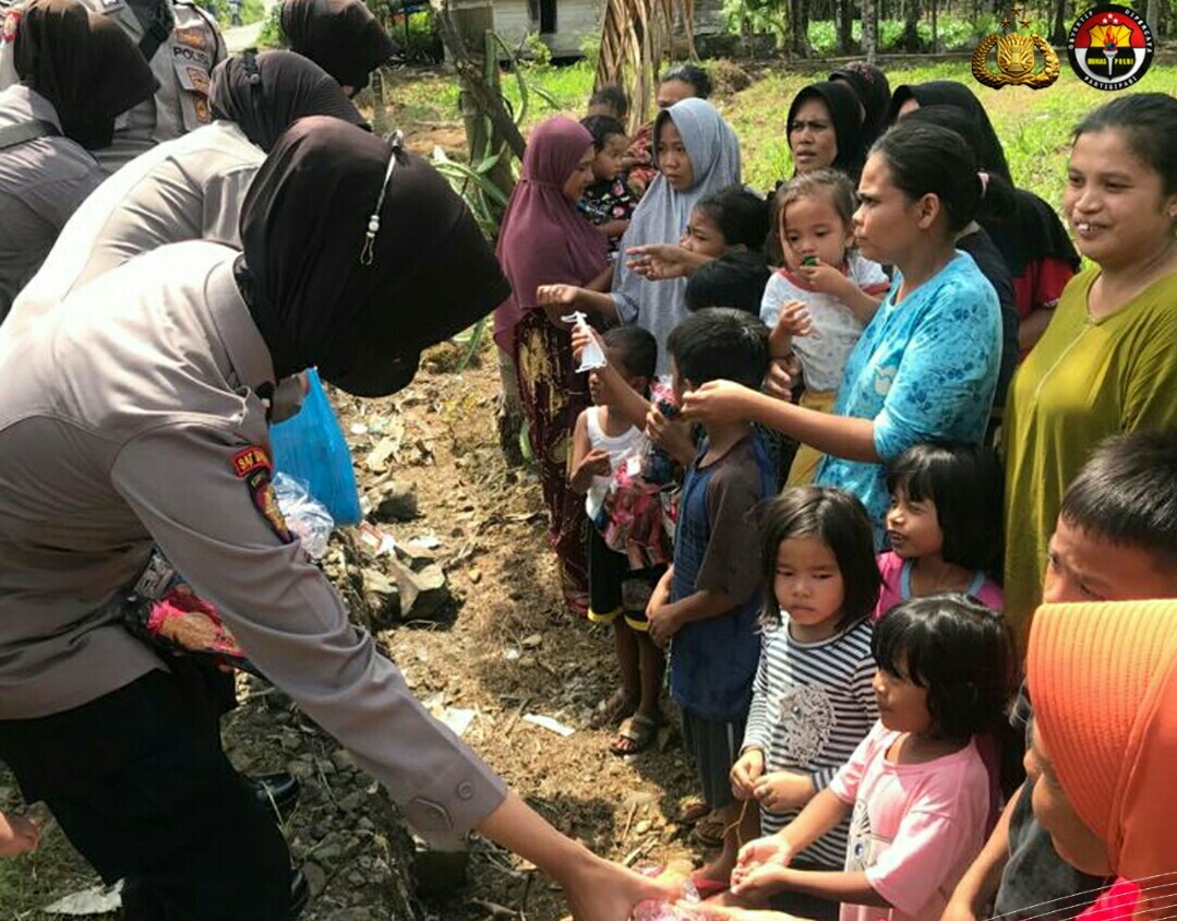 Selain itu, Polwan juga membagikan masker, susu, pampers, dan makanan ringan lainnya untuk dikonsumsi anak-anak dan balita.