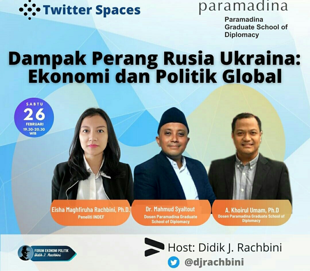 Demikian disampaikan Dr. M. Syaltout Dosen Paramadina Graduate School of Diplomacy pada Forum Ekonomi Politik Didik J. Rachbini bertajuk “Dampak Perang Rusia-Ukraina: Ekonomi dan Politik Global” yang digelar melalui platform Twitter Space, 26 Februari 2022.