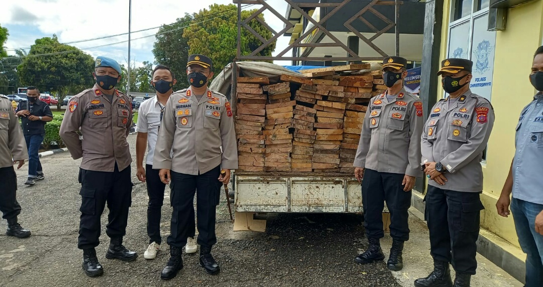 Kapolres, menyampaikan pengungkapan Kasus perkara tindak pidana membawa dan mengangkut hasil hutan kayu olahan tanpa dokumen yang sah berkat adanya laporan masyarakat ke Polres Dharmasraya.